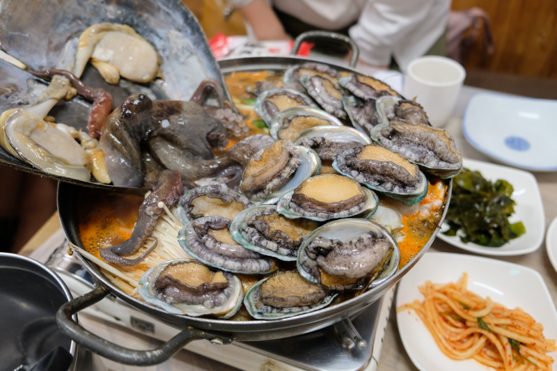 這一鍋我最驚艷就是鮑魚,數量多到撈不完不說,原本以為整顆煮或許口感會偏韌,也會比較難咬斷,沒想到完全不是如此,鮑魚口感意外的彈牙又不會過硬,一口咬下還很輕鬆,而且細細品味還能吃到淡淡海味的鮮甜,直到現在回想起來還想衝一次濟州島吃一鍋。