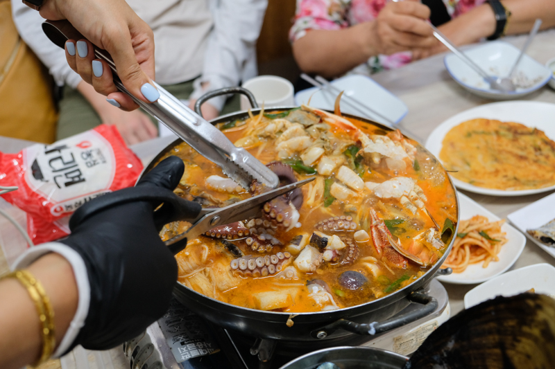 湯頭雖然看起來滿鍋紅,以為會很辣,但實際上並不會太辣,是典型韓式海鮮風味鍋,每一口都能感受到新鮮海鮮所釋放的鮮味,尤其是煮到後面,蔬菜和海鮮的甜味互相融合在一起,如果在冷冷的天,喝上一碗真的會讓人超級滿足。如果有來這一鍋絕對是必點的一道菜。
