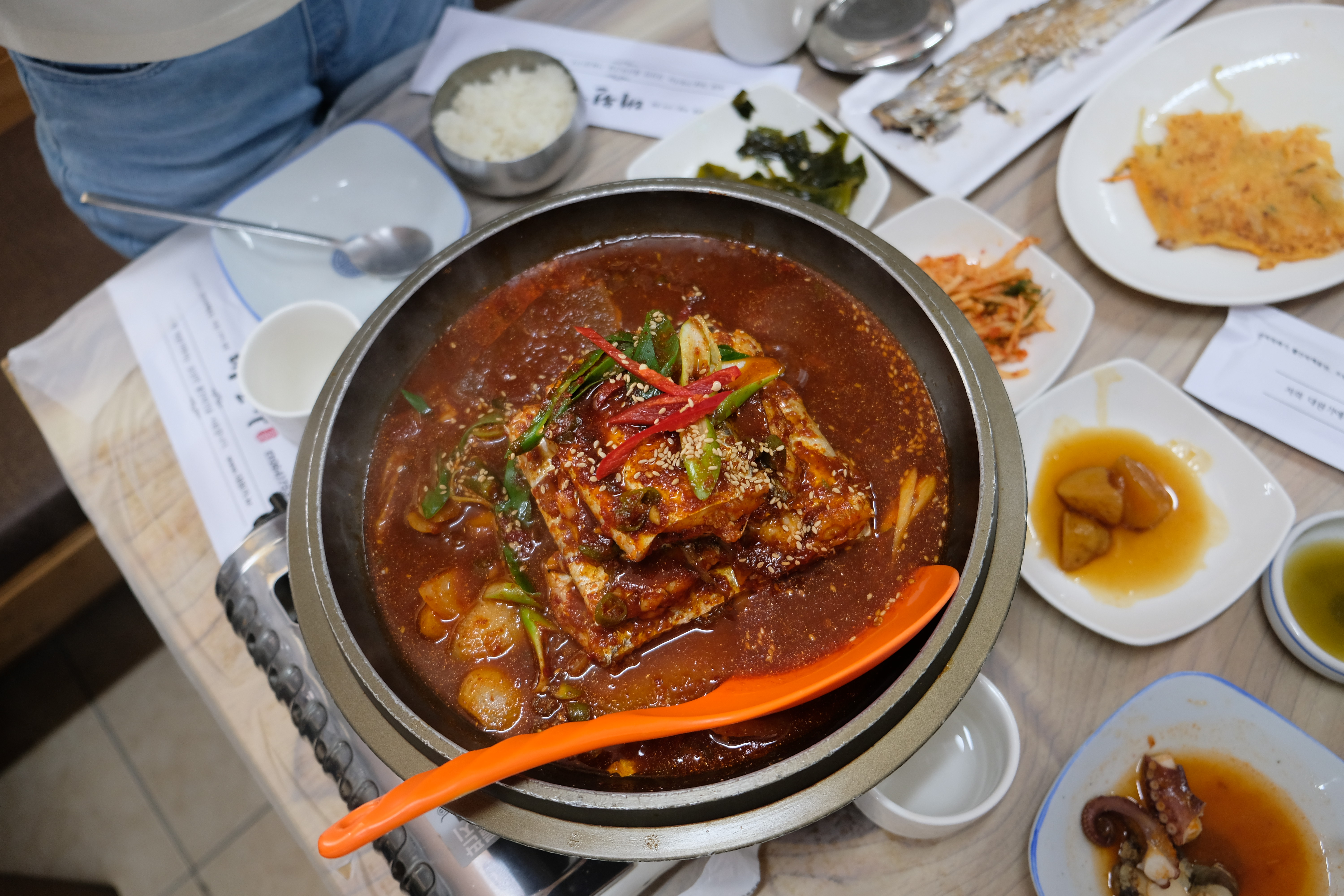 只有虎妹會說韓語,自然點餐的任務就交給虎妹處理,一共點了一個大的鮮鮑魚海鮮鍋、濟州醬燒白帶魚鍋與韓式鮑魚粥,還加上幾碗白飯與店家的小菜,我們一行七大三小吃的非常飽足,提供大家一個點餐的參考。