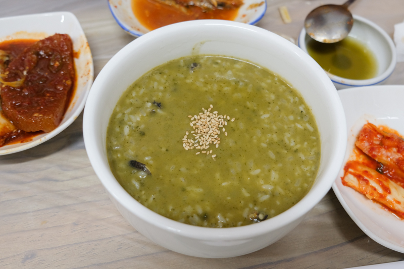 最後是老媽的回憶殺「鮑魚粥」,老媽什麼都忘了就記得這碗濟州島的鮑魚粥,這一趟老媽吃到可是讓她回憶滿滿。但當「鮑魚粥」送上桌時,讓我滿頭問號,我就在想點的不是「鮑魚粥」嗎?怎麼來了碗「台灣擂茶」,而且上面還撒了白芝麻又更像擂茶。原來鮑魚粥是用「鮑魚內臟」磨碎後與米一起熬煮而成,而鮑魚內臟本身帶綠褐色,煮進粥裡後會讓整鍋呈現淡淡的綠色,也會增加粥的鮮味與濃郁度。